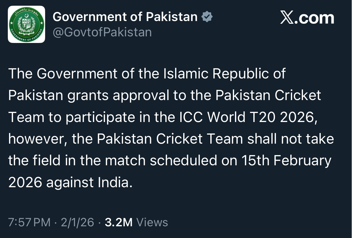 At 7:57 pm on Sunday, the Government of Pakistan announced on X that its cricket team would participate in the upcoming ICC Men’s T20 World Cup but would forfeit the match against India scheduled for February 15 at Colombo’s R Premadasa Stadium. It landed at a moment designed to be noticed.